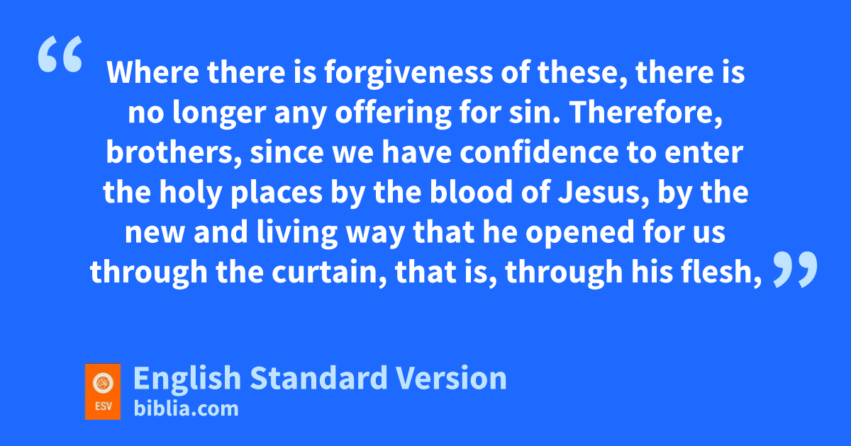 19 pTherefore, brothers,3 since we have confidence to enter qthe holy places by the blood of Jesus, 20 by rthe new and living way that he opened for us through sthe curtain, that is, through his flesh, 21 and since we have ta great priest over the house of God, 22 let us draw near with a true heart in full assurance of faith, with our hearts usprinkled clean vfrom an evil conscience and our bodies wwashed with pure water. 23 xLet us hold fast the confession of our hope without wavering, for yhe who promised is faithful. 24 And zlet us consider how to stir up one another to love and good works, 25 anot neglecting to meet together, as is the habit of some, but encouraging one another, and ball the more as you see cthe Day drawing near.