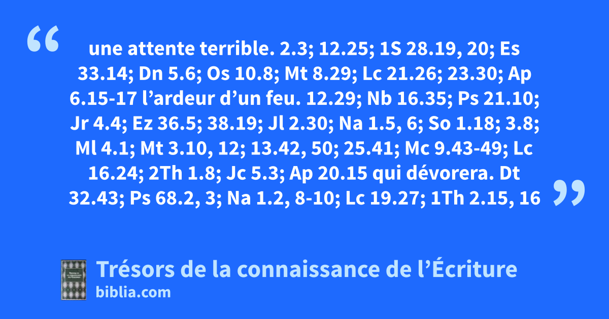 une attente terrible. 2.3; 12.25; 1S 28.19, 20; Es 33.14; Dn 5.6; Os 10.8; Mt 8.29; Lc 21.26; 23.30; Ap 6.15-17 l’ardeur d’un feu. 12.29; Nb 16.35; Ps 21.10; Jr 4.4; Ez 36.5; 38.19; Jl 2.30; Na 1.5, 6; So 1.18; 3.8; Ml 4.1; Mt 3.10, 12; 13.42, 50; 25.41; Mc 9.43-49; Lc 16.24; 2Th 1.8; Jc 5.3; Ap 20.15 qui dévorera. Dt 32.43; Ps 68.2, 3; Na 1.2, 8-10; Lc 19.27; 1Th 2.15, 16