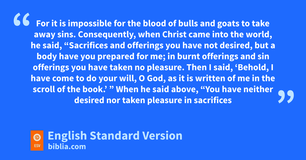 8 When he said above, “You have neither desired nor taken pleasure in csacrifices and offerings and burnt offerings and sin offerings” (these are offered according to the law), 9 then he added, d“Behold, I have come to do your will.” He does away with the first in order to establish the second. 10 And by that will ewe have been sanctified through the offering of fthe body of Jesus Christ gonce for all.
