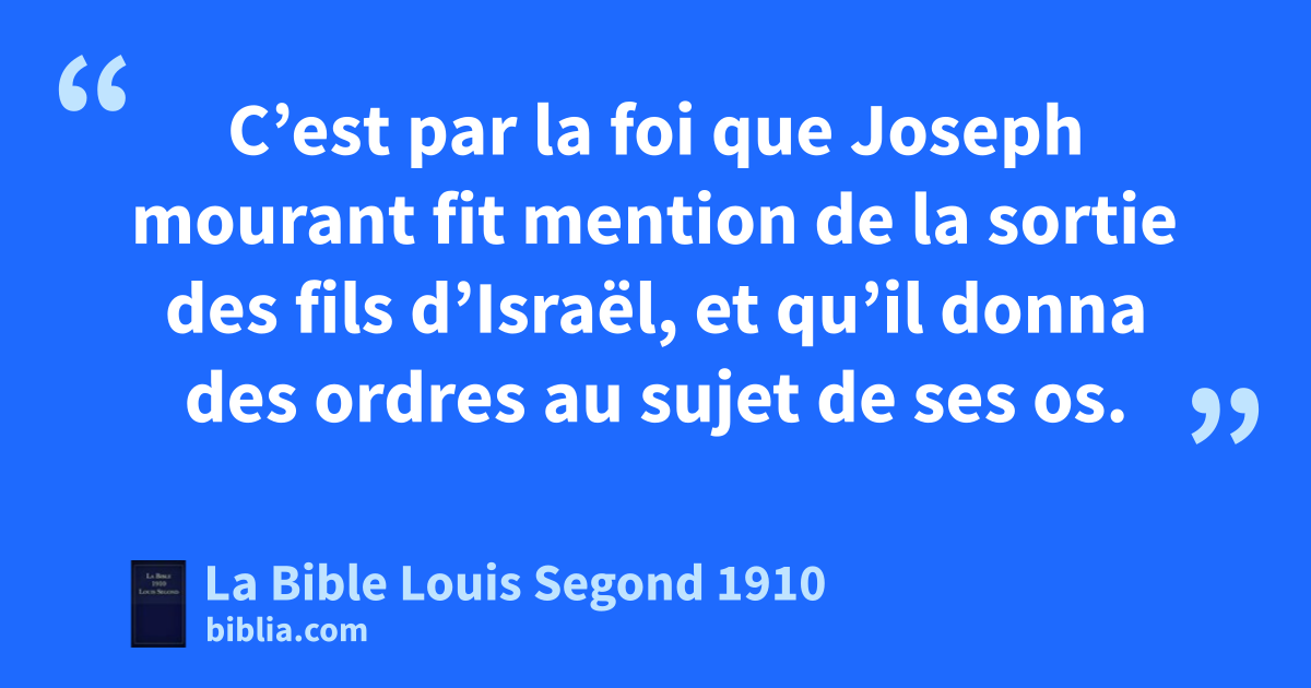 20pC’est par la foi qu’Isaac bénit Jacob et Ésaü, en vue des choses à venir. 21qC’est par la foi que Jacob mourant bénit chacun des fils de Joseph, ret qu’il adora, appuyé sur l’extrémité de son bâton. 22sC’est par la foi que Joseph mourant fit mention de la sortie des fils d’Israël, et qu’il donna des ordres au sujet de ses os.