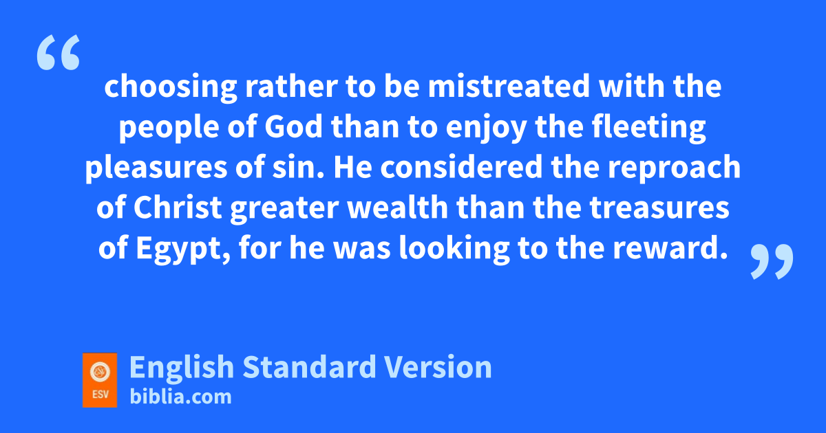23 By faith qMoses, when he was born, was hidden for three months by his parents, because they saw that the child was beautiful, and they were not afraid of rthe king’s edict. 24 By faith Moses, when he was grown up, srefused to be called the son of Pharaoh’s daughter, 25 tchoosing rather to be mistreated with the people of God than to enjoy uthe fleeting pleasures of sin. 26 vHe considered the reproach of Christ greater wealth than the treasures of Egypt, for he was looking to wthe reward. 27 By faith he xleft Egypt, ynot being afraid of the anger of the king, for he endured zas seeing him who is invisible. 28 By faith ahe kept the Passover and sprinkled the blood, so that the Destroyer of the firstborn might not touch them.