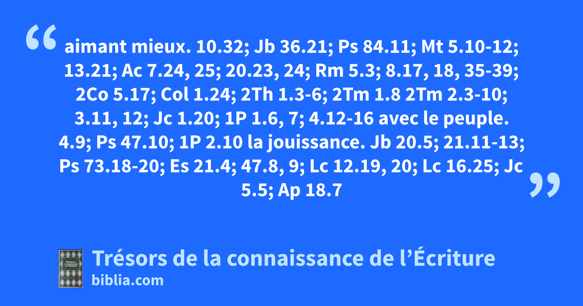 aimant mieux. 10.32; Jb 36.21; Ps 84.11; Mt 5.10-12; 13.21; Ac 7.24, 25; 20.23, 24; Rm 5.3; 8.17, 18, 35-39; 2Co 5.17; Col 1.24; 2Th 1.3-6; 2Tm 1.8 2Tm 2.3-10; 3.11, 12; Jc 1.20; 1P 1.6, 7; 4.12-16 avec le peuple. 4.9; Ps 47.10; 1P 2.10 la jouissance. Jb 20.5; 21.11-13; Ps 73.18-20; Es 21.4; 47.8, 9; Lc 12.19, 20; Lc 16.25; Jc 5.5; Ap 18.7