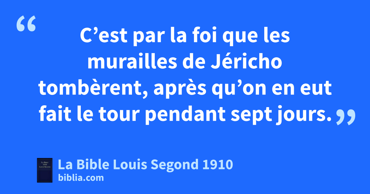 30xC’est par la foi que les murailles de Jéricho tombèrent, après qu’on en eut fait le tour pendant sept jours. 31yC’est par la foi que Rahab la prostituée ne périt pas avec les rebelles, zparce qu’elle avait reçu les espions avec bienveillance. 32Et que dirai-je encore? Car le temps me manquerait pour parler de aGédéon, de bBarak, de cSamson, de dJephthé, de eDavid, de fSamuel, et des prophètes, 33qui, par la foi, vainquirent des royaumes, exercèrent la justice, obtinrent des promesses, fermèrent gla gueule des lions, 34héteignirent la puissance du feu, iéchappèrent au tranchant de l’épée, jguérirent de leurs maladies, furent vaillants à la guerre, mirent en fuite des armées étrangères. 35kDes femmes recouvrèrent leurs morts par la résurrection; ld’autres furent livrés aux tourments, et n’acceptèrent point de délivrance, afin d’obtenir une meilleure résurrection; 36d’autres subirent les moqueries et le fouet, mles chaînes et la prison; 37nils furent lapidés, sciés, torturés, ils moururent tués par l’épée, ils allèrent çà et là ovêtus de peaux de brebis et de peaux de chèvres, dénués de tout, persécutés, maltraités, 38eux dont le monde n’était pas digne, errants dans les déserts et les montagnes, dans les cavernes et les antres de la terre. 39Tous ceux-là, à la foi desquels il a été rendu témoignage, n’ont pas obtenu ce qui leur était promis, 40Dieu ayant en vue quelque chose de meilleur pour nous, afin qu’ils ne parvinssent pas sans nous à la perfection.