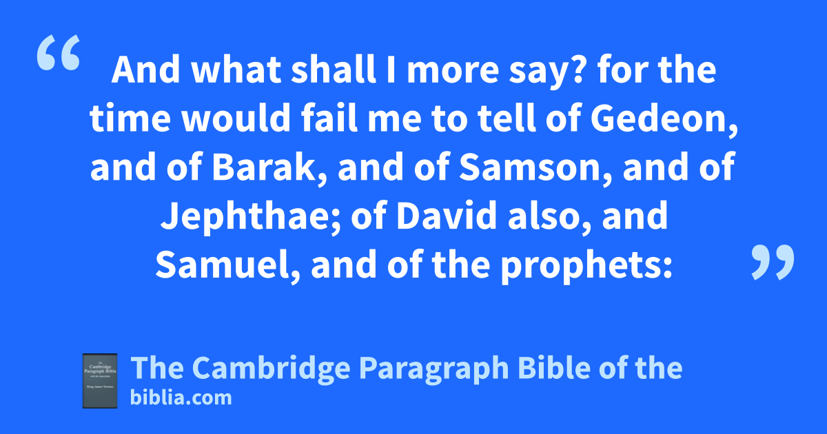 32 And what shall I more say? for the time would fail me to tell of nGedeon, and of oBarak, and of pSamson, and of qJephthae; of rDavid also, and stSamuel, and of tthe prophets: 33 who through faith usubdued kingdoms, vwrought righteousness, wobtained promises, xstopped the mouths of lions, 34 yquenched the violence of fire, zescaped athe edge of the sword, bout of weakness cwere made strong, dwaxed valiant in fight, dturned to flight ethe armies of fthe aliens. 35 gWomen received their dead raised to life again: and others hwere tortured, inot accepting deliverance; kthat they might obtain la better resurrection: 36 and others had trial of cruel mmockings and nscourgings, yea, moreover of obonds and imprisonment: 37 they were pstoned, they were qsawn asunder, were tempted, rwere slain with the sword: they wandered about sin sheepskins and goatskins; being destitute, afflicted, ttormented; 38 u(of whom the world was not worthy:) vthey wandered in deserts, and in mountains, and win xdens and xxcaves of the earth. 39 And these all, yhaving obtained a good report through faith, zreceived not the promise: 40 God having * provided some lbetter thing for us, athat they without us should not be bmade perfect.
