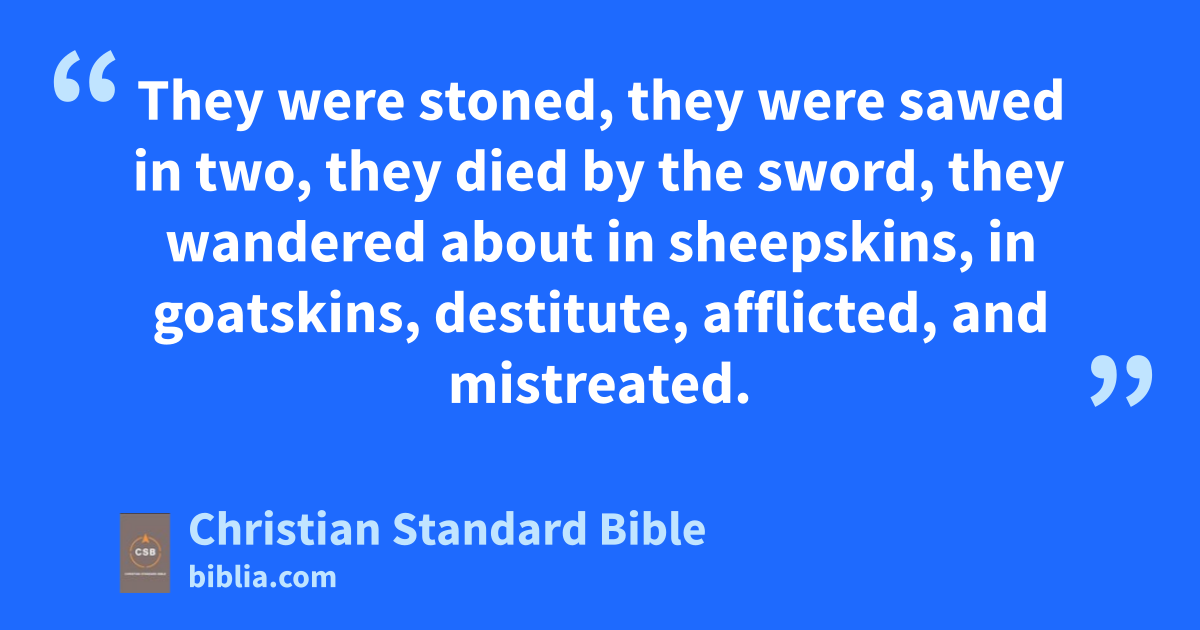 32 And what more can I say? Time is too short for me to tell about Gideon, Barak, Samson, Jephthah,y David, Samuel, and the prophets,z 33 who by faith conquered kingdoms,aa administered justice, obtained promises, shut the mouths of lions,ab 34 quenched the raging of fire, escaped the edge of the sword, gained strength in weakness, became mighty in battle, and put foreign armies to flight.a 35 Women received their dead, raised to life again. Other people were tortured, not accepting release, so that they might gain a better resurrection. 36 Others experienced mockings and scourgings, as well as bonds and imprisonment.b 37 They were stoned,F,c they were sawed in two, they died by the sword, they wandered about in sheepskins, in goatskins,d destitute, afflicted, and mistreated. 38 The world was not worthy of them. They wandered in deserts and on mountains, hiding in caves and holes in the ground.