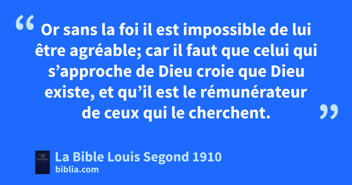 4C’est par la foi cqu’Abel offrit à Dieu un sacrifice plus excellent que celui de Caïn; c’est par elle qu’il dfut déclaré juste, Dieu approuvant ses offrandes; et c’est par elle qu’il parle encore, quoique mort. 5C’est par la foi equ’Énoch fut enlevé pour qu’il ne vît point la mort, et qu’il ne parut plus parce que Dieu l’avait enlevé; car, avant son enlèvement, il avait reçu le témoignage qu’il était agréable à Dieu. 6Or sans la foi il est impossible de lui être agréable; car il faut que celui qui s’approche de Dieu croie que Dieu existe, et qu’il est le rémunérateur de ceux qui le cherchent. 7C’est par la foi que fNoé, divinement averti des choses qu’on ne voyait pas encore, et saisi d’une crainte respectueuse, construisit une arche pour sauver sa famille; c’est par elle qu’il condamna le monde, et devint héritier de la justice qui s’obtient par la foi.