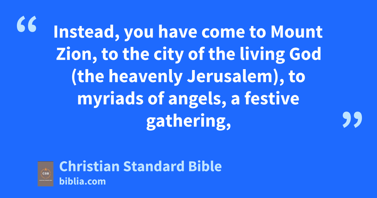 18 For you have not come to what could be touched, to a blazing fire, to darkness, gloom, and storm, 19 to the blast of a trumpet, and the sound of words. Those who heard it begged that not another word be spoken to them, 20 for they could not bear what was commanded: If even an animal touches the mountain, it must be stoned.A,x 21 The appearance was so terrifying that Moses said, I am trembling with fear.B,y 22 Instead, you have come to Mount Zion, to the city of the living God (the heavenly Jerusalem), to myriads of angels, a festive gathering,z 23 to the assembly of the firstborn whose names have been writtenC in heaven, to a Judge, who is God of all, to the spirits of righteous people made perfect,aa 24 and to Jesus, the mediatorab of a new covenant,ac and to the sprinkled blood, which says better things than the blood of Abel.ad