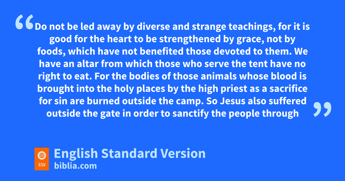 7 Remember fyour leaders, those who spoke to you the word of God. Consider the outcome of their way of life, and gimitate their faith. 8 Jesus Christ is hthe same yesterday and today and forever. 9 Do not be iled away by diverse and strange teachings, for it is good for the heart to be strengthened by grace, jnot by foods, which have not benefited those devoted to them. 10 We have an altar kfrom which those who serve the tent1 have no right to eat. 11 For lthe bodies of those animals whose blood is brought into the holy places by the high priest as a sacrifice for sin are burned moutside the camp. 12 So Jesus also nsuffered ooutside the gate in order to sanctify the people pthrough his own blood. 13 Therefore let us go to him outside the camp and bear qthe reproach he endured. 14 For rhere we have no lasting city, but we seek the city that is to come. 15 sThrough him then let us continually offer up ta sacrifice of praise to God, that is, uthe fruit of lips that acknowledge his name. 16 Do not neglect to do good and vto share what you have, for such wsacrifices are pleasing to God.
