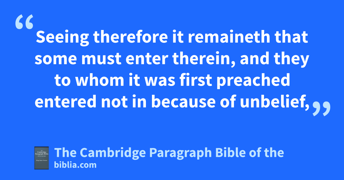 IV. Let us therefore fear, lest, a promise being left us of entering into his rest, any of you ashould seem bto come short of it. 2 For unto us was the gospel preached, as well as cunto them: but * the word preached did not profit them, * dnot being mixed with faith in them that heard it. 3 For we which have believed do enter into rest, as ehe said, fAs I have sworn in my wrath, if they shall enter into my rest: although the works were finished gfrom the foundation of the world. 4 For ehe spake in a certain place of the seventh day on this wise, hAnd God did rest the seventh day from all his works. 5 And in this place again, fIf they shall enter into my rest. 6 Seeing therefore it remaineth that some must enter therein, and cthey to whom * it was first preached ientered not in because of unbelief, 7 again, he limiteth a certain day, saying kin David, lTo day, after so long a time; as it is said, lTo day if ye will hear his voice, harden not your hearts. 8 For if * Jesus had given them rest, then would he not afterward have spoken of another day. 9 There remaineth therefore a * rest to the people of God. 10 For mhe that is entered into his rest, he also hath ceased from his own works, as God did from his. 11 Let us labour therefore to enter into that rest, lest any man fall nafter the same oexample of * punbelief. 12 For qthe word of God is rquick, and powerful, and ssharper than any ttwoedged sword, piercing even to the dividing asunder of usoul and spirit, and of the joints and marrow, and is va discerner of the thoughts and wintents of the heart. 13 xNeither is there any creature that is not manifest in his sight: but all things are ynaked and opened unto the eyes of him with whom we have to do.