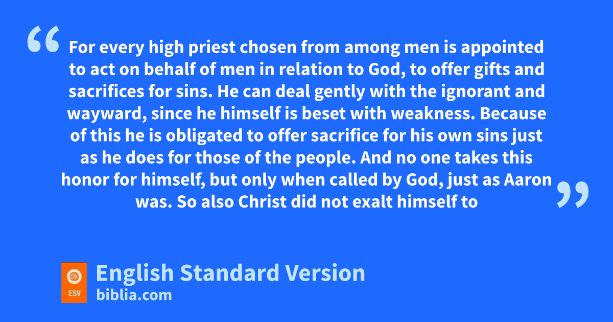 5 For every high priest chosen from among men jis appointed to act on behalf of men kin relation to God, lto offer gifts and sacrifices for sins. 2 mHe can deal gently with the ignorant and wayward, since he himself nis beset with weakness. 3 Because of this he is obligated to offer sacrifice for his own sins ojust as he does for those of the people. 4 And pno one takes this honor for himself, but only when called by God, qjust as Aaron was.