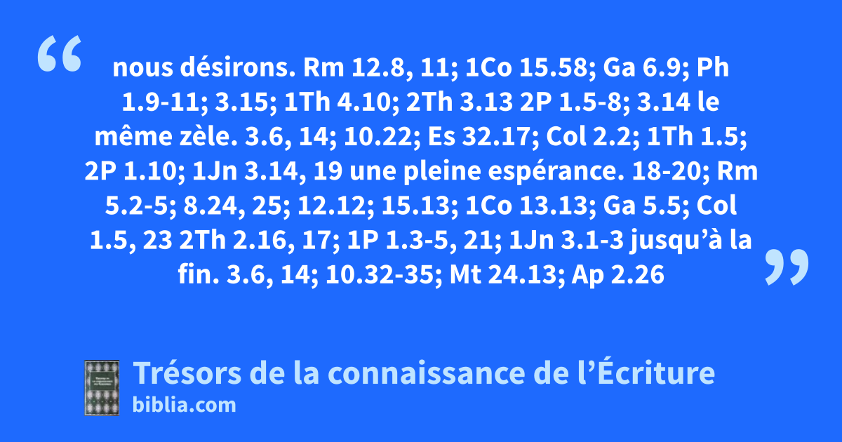 nous désirons. Rm 12.8, 11; 1Co 15.58; Ga 6.9; Ph 1.9-11; 3.15; 1Th 4.10; 2Th 3.13 2P 1.5-8; 3.14 le même zèle. 3.6, 14; 10.22; Es 32.17; Col 2.2; 1Th 1.5; 2P 1.10; 1Jn 3.14, 19 une pleine espérance. 18-20; Rm 5.2-5; 8.24, 25; 12.12; 15.13; 1Co 13.13; Ga 5.5; Col 1.5, 23 2Th 2.16, 17; 1P 1.3-5, 21; 1Jn 3.1-3 jusqu’à la fin. 3.6, 14; 10.32-35; Mt 24.13; Ap 2.26