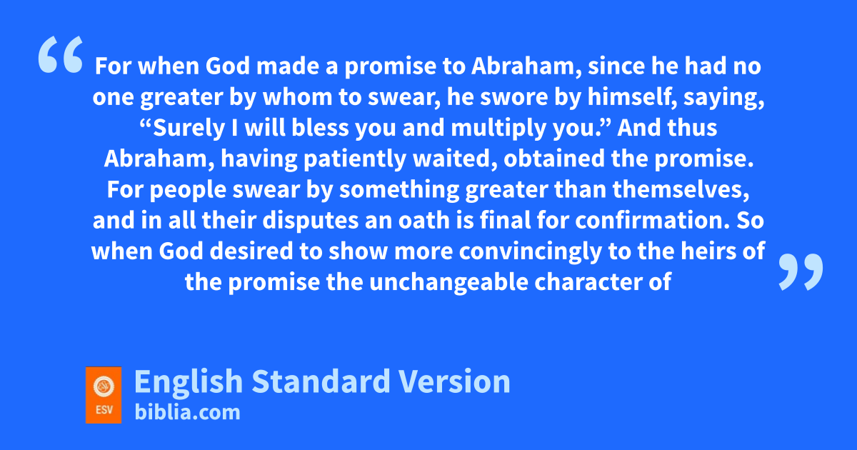 13 For when God made a promise to Abraham, since he had no one greater by whom to swear, ehe swore by himself, 14 saying, f“Surely I will bless you and multiply you.” 15 And thus Abraham,2 ghaving patiently waited, obtained the promise. 16 For people swear by something greater than themselves, and in all their disputes han oath is final for confirmation. 17 So when God desired to show more convincingly to ithe heirs of the promise jthe unchangeable character of his purpose, khe guaranteed it with an oath, 18 so that by two unchangeable things, in which lit is impossible for God to lie, we who have fled for refuge might have strong encouragement to hold fast to the hope mset before us. 19 We have this as a sure and steadfast anchor of the soul, a hope that enters into nthe inner place behind the curtain, 20 where Jesus has gone oas a forerunner on our behalf, phaving become a high priest forever after the order of Melchizedek.