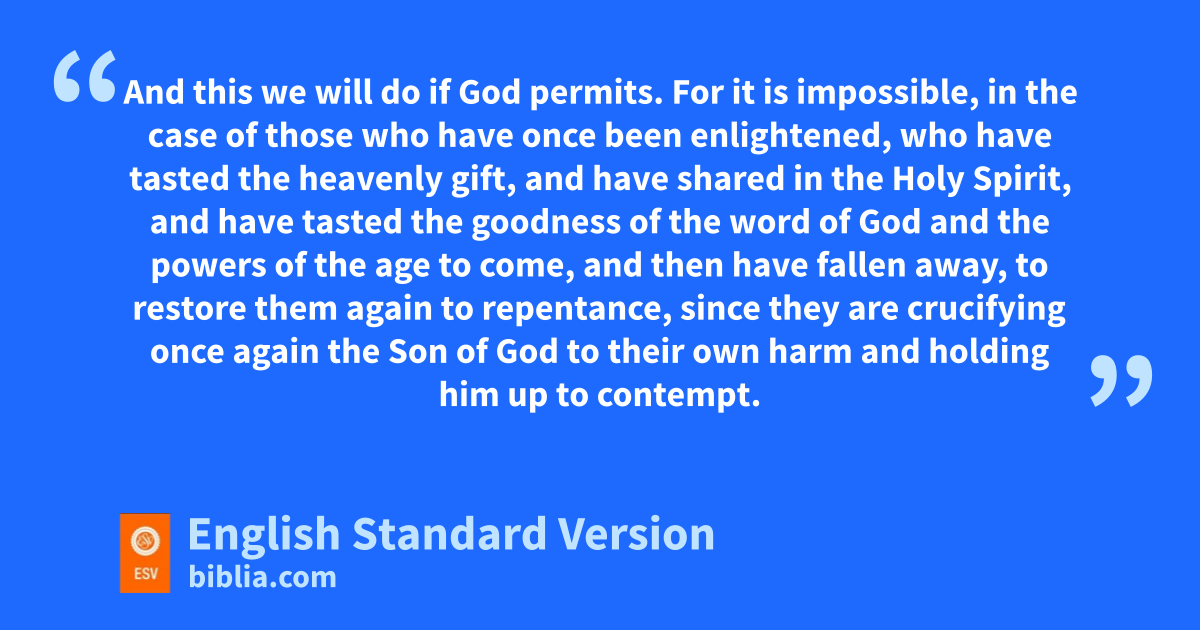 6 Therefore ilet us leave jthe elementary doctrine of Christ and go on to maturity, not laying again a foundation of repentance kfrom dead works and of faith toward God, 2 and of linstruction about washings,1 mthe laying on of hands, nthe resurrection of the dead, and oeternal judgment. 3 And this we will do pif God permits. 4 For it is impossible, in the case of those qwho have once been enlightened, who have tasted rthe heavenly gift, and shave shared in the Holy Spirit, 5 and thave tasted the goodness of the word of God and the powers of the age to come, 6 and uthen have fallen away, to restore them again to repentance, since vthey are crucifying once again the Son of God to their own harm and holding him up to contempt. 7 For wland that has drunk the rain that often falls on it, and produces a crop useful to those for whose sake it is cultivated, receives a blessing from God. 8 But xif it bears thorns and thistles, it is worthless and near to being cursed, yand its end is to be burned.