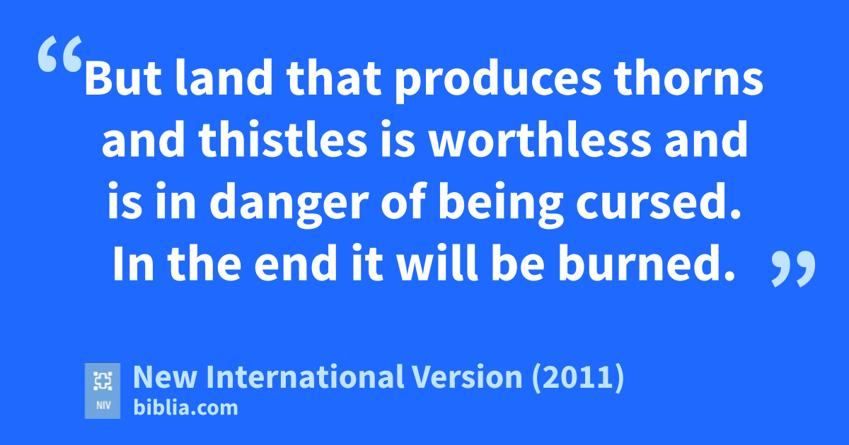 4 It is impossible for those who have once been enlightened,f who have tasted the heavenly gift,g who have shared in the Holy Spirit,h 5 who have tasted the goodnessi of the word of Godj and the powers of the coming age 6 and who have fallenc away, to be brought back to repentance.k To their loss they are crucifying the Son of Godl all over again and subjecting him to public disgrace. 7 Land that drinks in the rain often falling on it and that produces a crop useful to those for whom it is farmed receives the blessing of God. 8 But land that produces thorns and thistles is worthless and is in danger of being cursed.m In the end it will be burned.