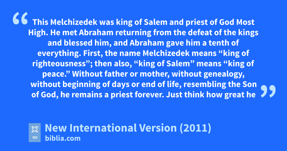 7 This Melchizedek was king of Salemf and priest of God Most High.g He met Abraham returning from the defeat of the kings and blessed him,h 2 and Abraham gave him a tenth of everything. First, the name Melchizedek means “king of righteousness”; then also, “king of Salem” means “king of peace.” 3 Without father or mother, without genealogy,i without beginning of days or end of life, resembling the Son of God,j he remains a priest forever.