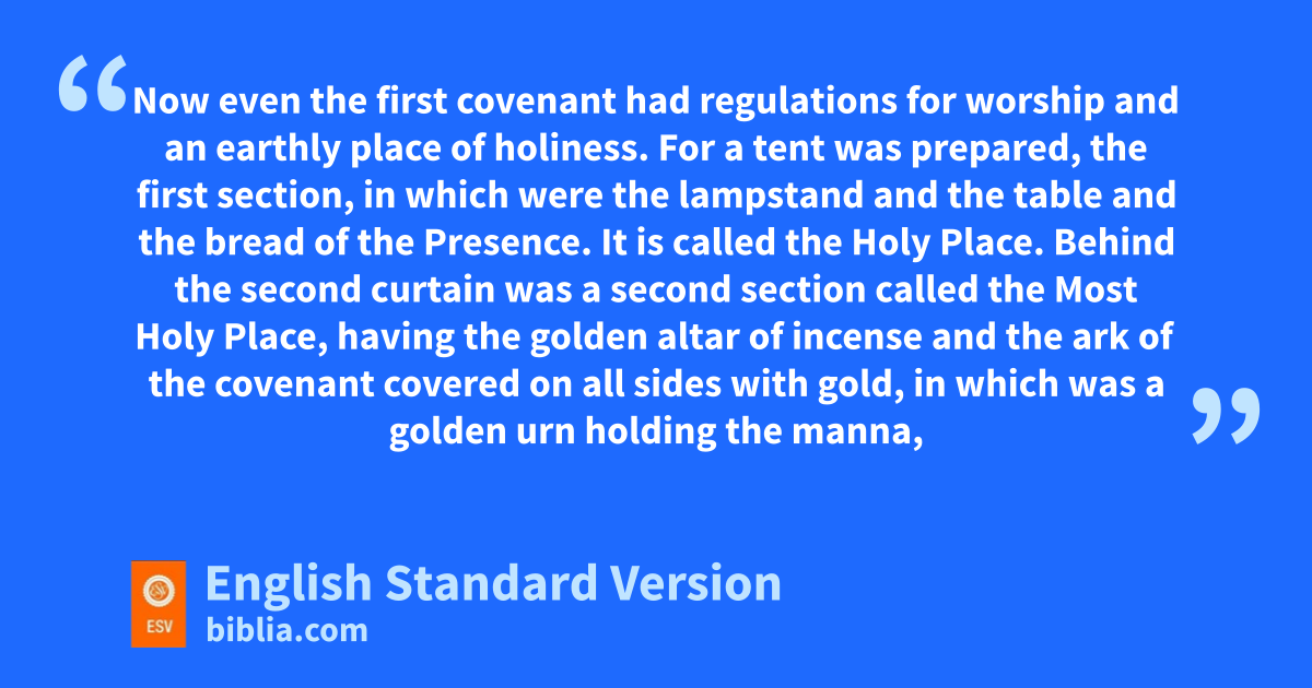 9 Now even the first covenant had regulations for worship and man earthly place of holiness. 2 For na tent1 was prepared, the first section, in which were othe lampstand and pthe table and qthe bread of the Presence.2 It is called the Holy Place. 3 Behind rthe second curtain was a second section3 called the Most Holy Place, 4 having the golden saltar of incense and tthe ark of the covenant covered on all sides with gold, in which was ua golden urn holding the manna, and vAaron’s staff that budded, and wthe tablets of the covenant. 5 Above it were xthe cherubim of glory overshadowing ythe mercy seat. Of these things we cannot now speak in detail.