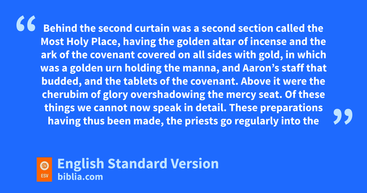 9 Now even the first covenant had regulations for worship and man earthly place of holiness. 2 For na tent1 was prepared, the first section, in which were othe lampstand and pthe table and qthe bread of the Presence.2 It is called the Holy Place. 3 Behind rthe second curtain was a second section3 called the Most Holy Place, 4 having the golden saltar of incense and tthe ark of the covenant covered on all sides with gold, in which was ua golden urn holding the manna, and vAaron’s staff that budded, and wthe tablets of the covenant. 5 Above it were xthe cherubim of glory overshadowing ythe mercy seat. Of these things we cannot now speak in detail.