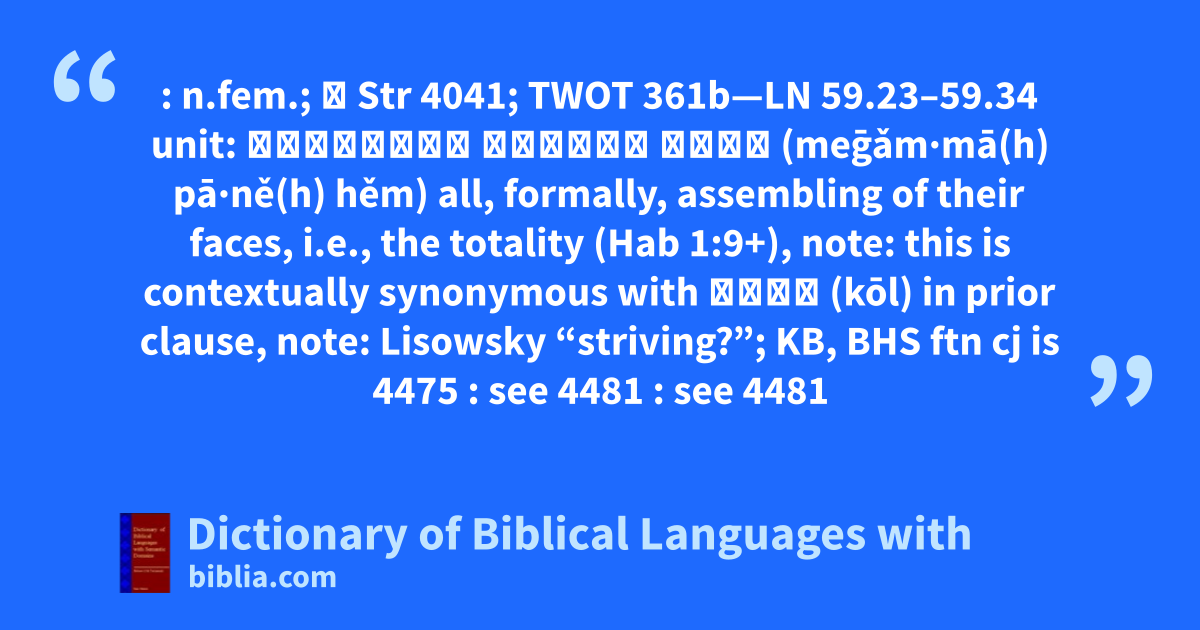 : n.fem.; ≡ Str 4041; TWOT 361b—LN 59.23–59.34 unit: מְגַמָּה פָּנֶה ־הֶם (meḡǎm·mā(h) pā·ně(h) hěm) all, formally, assembling of their faces, i.e., the totality (Hab 1:9+), note: this is contextually synonymous with כֹּל (kōl) in prior clause, note: Lisowsky “striving?”; KB, BHS ftn cj is 4475 : see 4481 : see 4481