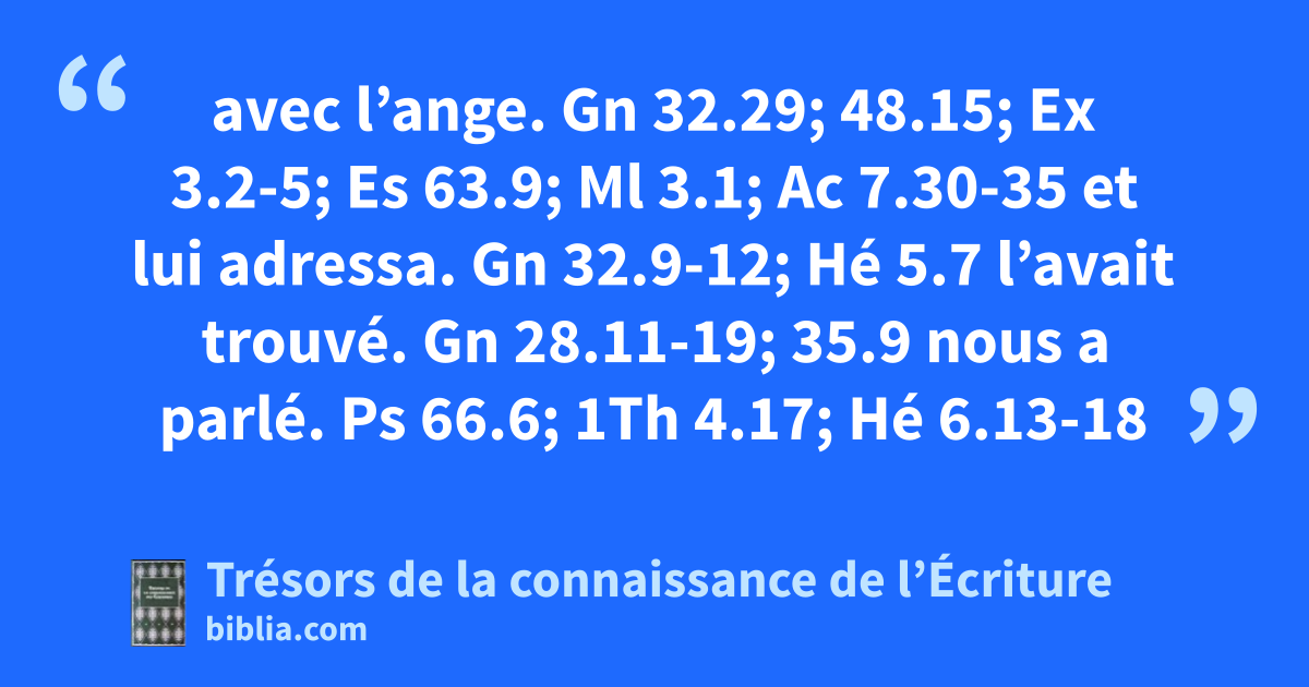 avec l’ange. Gn 32.29; 48.15; Ex 3.2-5; Es 63.9; Ml 3.1; Ac 7.30-35 et lui adressa. Gn 32.9-12; Hé 5.7 l’avait trouvé. Gn 28.11-19; 35.9 nous a parlé. Ps 66.6; 1Th 4.17; Hé 6.13-18