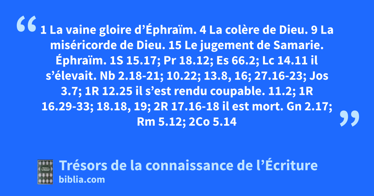 1 La vaine gloire d’Éphraïm. 4 La colère de Dieu. 9 La miséricorde de Dieu. 15 Le jugement de Samarie.