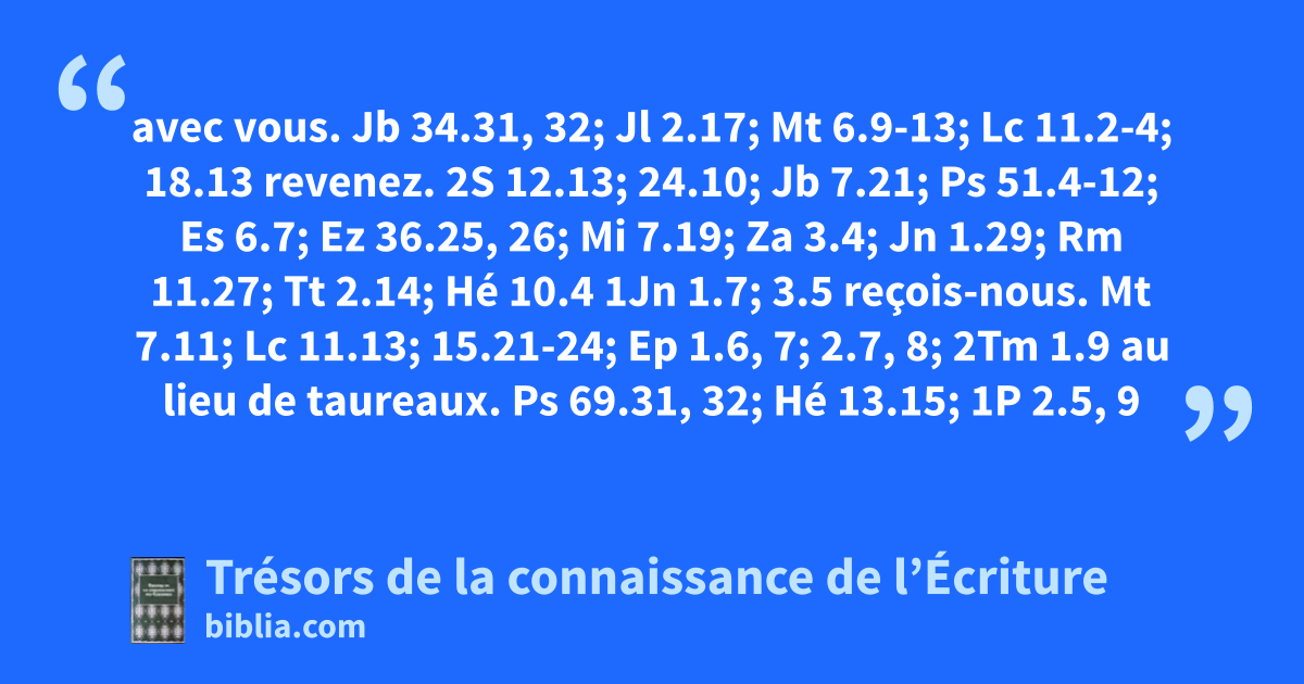 avec vous. Jb 34.31, 32; Jl 2.17; Mt 6.9-13; Lc 11.2-4; 18.13 revenez. 2S 12.13; 24.10; Jb 7.21; Ps 51.4-12; Es 6.7; Ez 36.25, 26; Mi 7.19; Za 3.4; Jn 1.29; Rm 11.27; Tt 2.14; Hé 10.4 1Jn 1.7; 3.5 reçois-nous. Mt 7.11; Lc 11.13; 15.21-24; Ep 1.6, 7; 2.7, 8; 2Tm 1.9 au lieu de taureaux. Ps 69.31, 32; Hé 13.15; 1P 2.5, 9