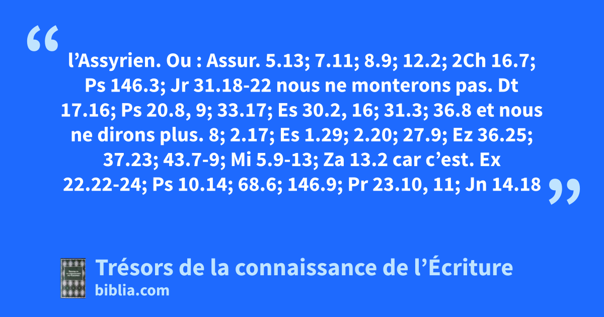 l’Assyrien. Ou : Assur. 5.13; 7.11; 8.9; 12.2; 2Ch 16.7; Ps 146.3; Jr 31.18-22 nous ne monterons pas. Dt 17.16; Ps 20.8, 9; 33.17; Es 30.2, 16; 31.3; 36.8 et nous ne dirons plus. 8; 2.17; Es 1.29; 2.20; 27.9; Ez 36.25; 37.23; 43.7-9; Mi 5.9-13; Za 13.2 car c’est. Ex 22.22-24; Ps 10.14; 68.6; 146.9; Pr 23.10, 11; Jn 14.18