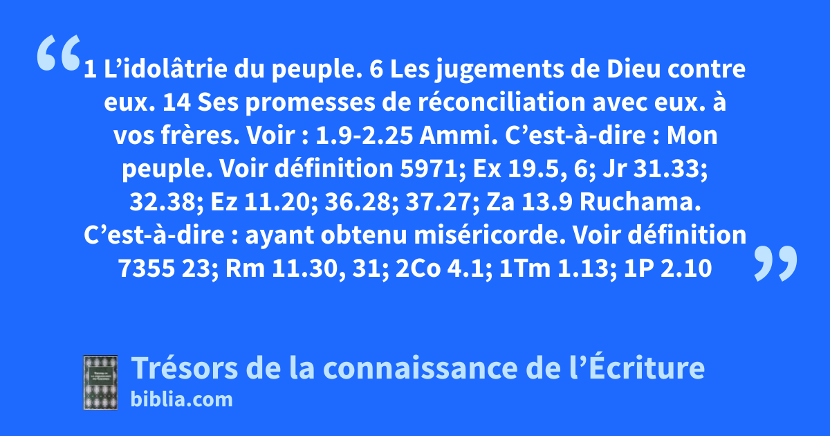 1 L’idolâtrie du peuple. 6 Les jugements de Dieu contre eux. 14 Ses promesses de réconciliation avec eux. à vos frères. Voir : 1.9-2.25 Ammi. C’est-à-dire : Mon peuple. Voir définition 5971; Ex 19.5, 6; Jr 31.33; 32.38; Ez 11.20; 36.28; 37.27; Za 13.9 Ruchama. C’est-à-dire : ayant obtenu miséricorde. Voir définition 7355 23; Rm 11.30, 31; 2Co 4.1; 1Tm 1.13; 1P 2.10