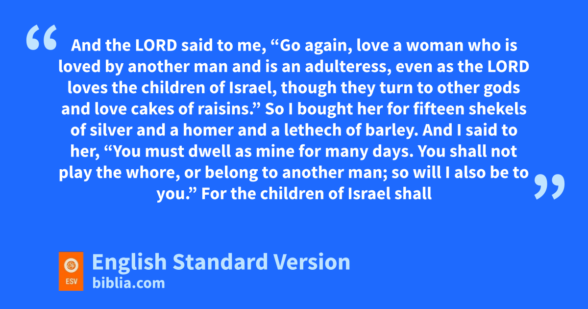 3 And the Lord said to me, x“Go again, love a woman who is loved by another man and is an adulteress, even as the Lord loves the children of Israel, though they turn to other gods and love cakes of raisins.” 2 So I bought her for fifteen shekels of silver and a yhomer and a lethech1 of barley. 3 And I said to her, “You must zdwell as mine for many days. You shall not play the whore, or belong to another man; so will I also be to you.” 4 For the children of Israel zshall dwell many days awithout king or prince, bwithout sacrifice or cpillar, without dephod or ehousehold gods. 5 Afterward fthe children of Israel shall return and gseek the Lord their God, and hDavid their king, iand they shall come in fear to the Lord and to his goodness in the jlatter days.