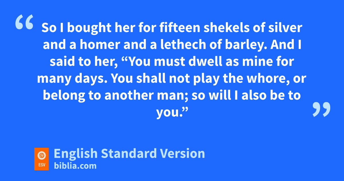 3 And the Lord said to me, x“Go again, love a woman who is loved by another man and is an adulteress, even as the Lord loves the children of Israel, though they turn to other gods and love cakes of raisins.” 2 So I bought her for fifteen shekels of silver and a yhomer and a lethech1 of barley. 3 And I said to her, “You must zdwell as mine for many days. You shall not play the whore, or belong to another man; so will I also be to you.” 4 For the children of Israel zshall dwell many days awithout king or prince, bwithout sacrifice or cpillar, without dephod or ehousehold gods. 5 Afterward fthe children of Israel shall return and gseek the Lord their God, and hDavid their king, iand they shall come in fear to the Lord and to his goodness in the jlatter days.