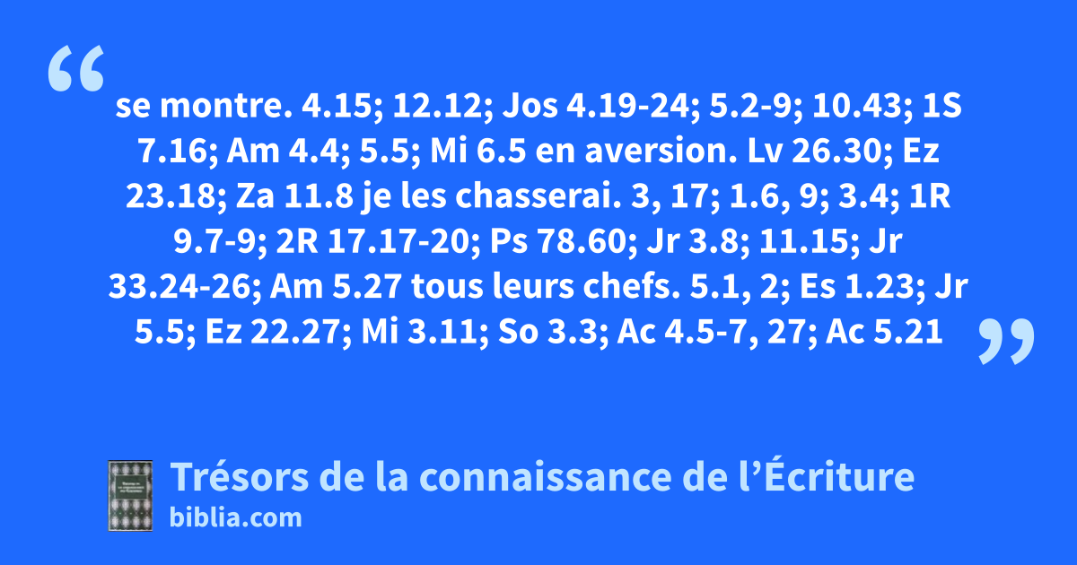 se montre. 4.15; 12.12; Jos 4.19-24; 5.2-9; 10.43; 1S 7.16; Am 4.4; 5.5; Mi 6.5 en aversion. Lv 26.30; Ez 23.18; Za 11.8 je les chasserai. 3, 17; 1.6, 9; 3.4; 1R 9.7-9; 2R 17.17-20; Ps 78.60; Jr 3.8; 11.15; Jr 33.24-26; Am 5.27 tous leurs chefs. 5.1, 2; Es 1.23; Jr 5.5; Ez 22.27; Mi 3.11; So 3.3; Ac 4.5-7, 27; Ac 5.21