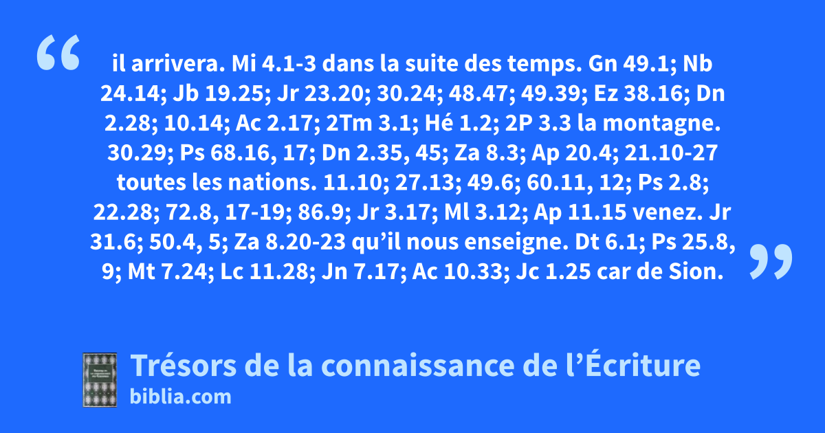 il arrivera. Mi 4.1-3 dans la suite des temps. Gn 49.1; Nb 24.14; Jb 19.25; Jr 23.20; 30.24; 48.47; 49.39; Ez 38.16; Dn 2.28; 10.14; Ac 2.17; 2Tm 3.1; Hé 1.2; 2P 3.3 la montagne. 30.29; Ps 68.16, 17; Dn 2.35, 45; Za 8.3; Ap 20.4; 21.10-27 toutes les nations. 11.10; 27.13; 49.6; 60.11, 12; Ps 2.8; 22.28; 72.8, 17-19; 86.9; Jr 3.17; Ml 3.12; Ap 11.15