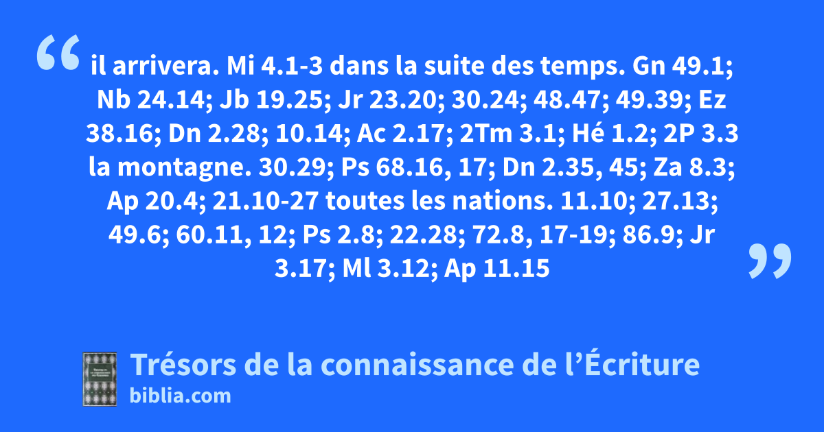 il arrivera. Mi 4.1-3 dans la suite des temps. Gn 49.1; Nb 24.14; Jb 19.25; Jr 23.20; 30.24; 48.47; 49.39; Ez 38.16; Dn 2.28; 10.14; Ac 2.17; 2Tm 3.1; Hé 1.2; 2P 3.3 la montagne. 30.29; Ps 68.16, 17; Dn 2.35, 45; Za 8.3; Ap 20.4; 21.10-27 toutes les nations. 11.10; 27.13; 49.6; 60.11, 12; Ps 2.8; 22.28; 72.8, 17-19; 86.9; Jr 3.17; Ml 3.12; Ap 11.15