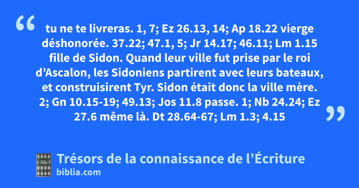 tu ne te livreras. 1, 7; Ez 26.13, 14; Ap 18.22 vierge déshonorée. 37.22; 47.1, 5; Jr 14.17; 46.11; Lm 1.15 fille de Sidon. Quand leur ville fut prise par le roi d’Ascalon, les Sidoniens partirent avec leurs bateaux, et construisirent Tyr. Sidon était donc la ville mère. 2; Gn 10.15-19; 49.13; Jos 11.8 passe. 1; Nb 24.24; Ez 27.6 même là. Dt 28.64-67; Lm 1.3; 4.15