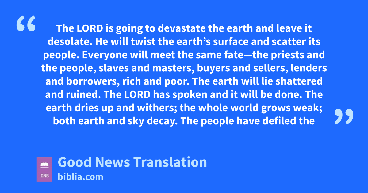 24 The Lord is going to devastate the earth and leave it desolate. He will twist the earth’s surface and scatter its people. 2Everyone will meet the same fate—the priests and the people, slaves and masters, buyers and sellers, lenders and borrowers, rich and poor. 3The earth will lie shattered and ruined. The Lord has spoken and it will be done.