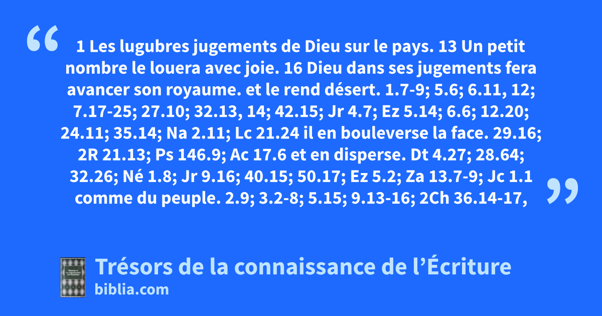 1 Les lugubres jugements de Dieu sur le pays. 13 Un petit nombre le louera avec joie. 16 Dieu dans ses jugements fera avancer son royaume.