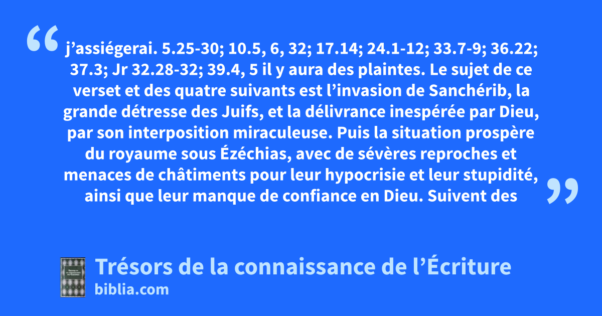 j’assiégerai. 5.25-30; 10.5, 6, 32; 17.14; 24.1-12; 33.7-9; 36.22; 37.3; Jr 32.28-32; 39.4, 5 il y aura des plaintes. Le sujet de ce verset et des quatre suivants est l’invasion de Sanchérib, la grande détresse des Juifs, et la délivrance inespérée par Dieu, par son interposition miraculeuse. Puis la situation prospère du royaume sous Ézéchias, avec de sévères reproches et menaces de châtiments pour leur hypocrisie et leur stupidité, ainsi que leur manque de confiance en Dieu. Suivent des promesses d’un temps meilleur. 34.6; Ez 22.31; 24.3-13; 39.17; So 1.7, 8; Ap 19.17, 18