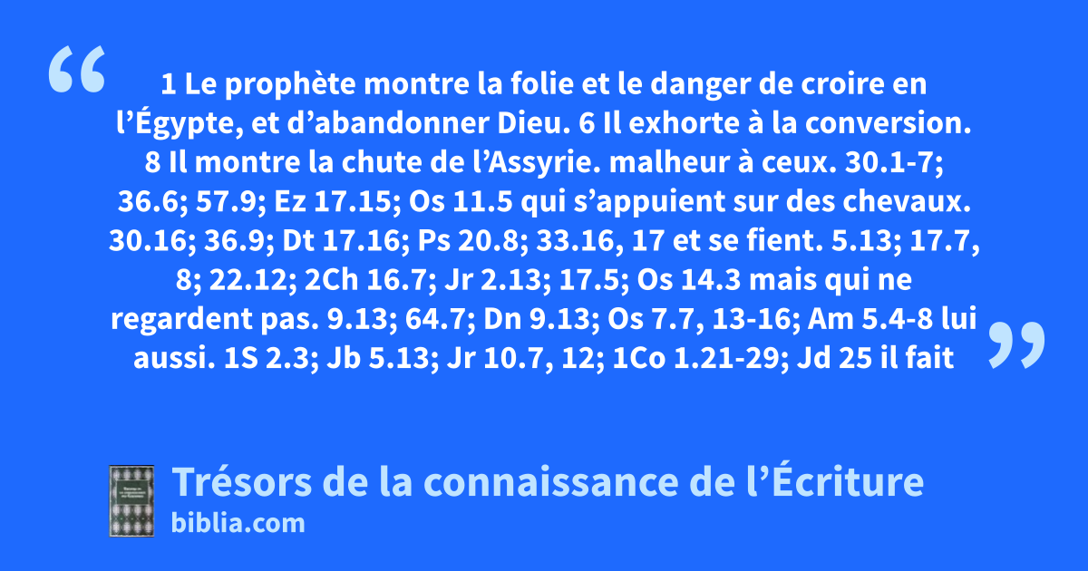 malheur à ceux. 30.1-7; 36.6; 57.9; Ez 17.15; Os 11.5 qui s’appuient sur des chevaux. 30.16; 36.9; Dt 17.16; Ps 20.8; 33.16, 17 et se fient. 5.13; 17.7, 8; 22.12; 2Ch 16.7; Jr 2.13; 17.5; Os 14.3 mais qui ne regardent pas. 9.13; 64.7; Dn 9.13; Os 7.7, 13-16; Am 5.4-8