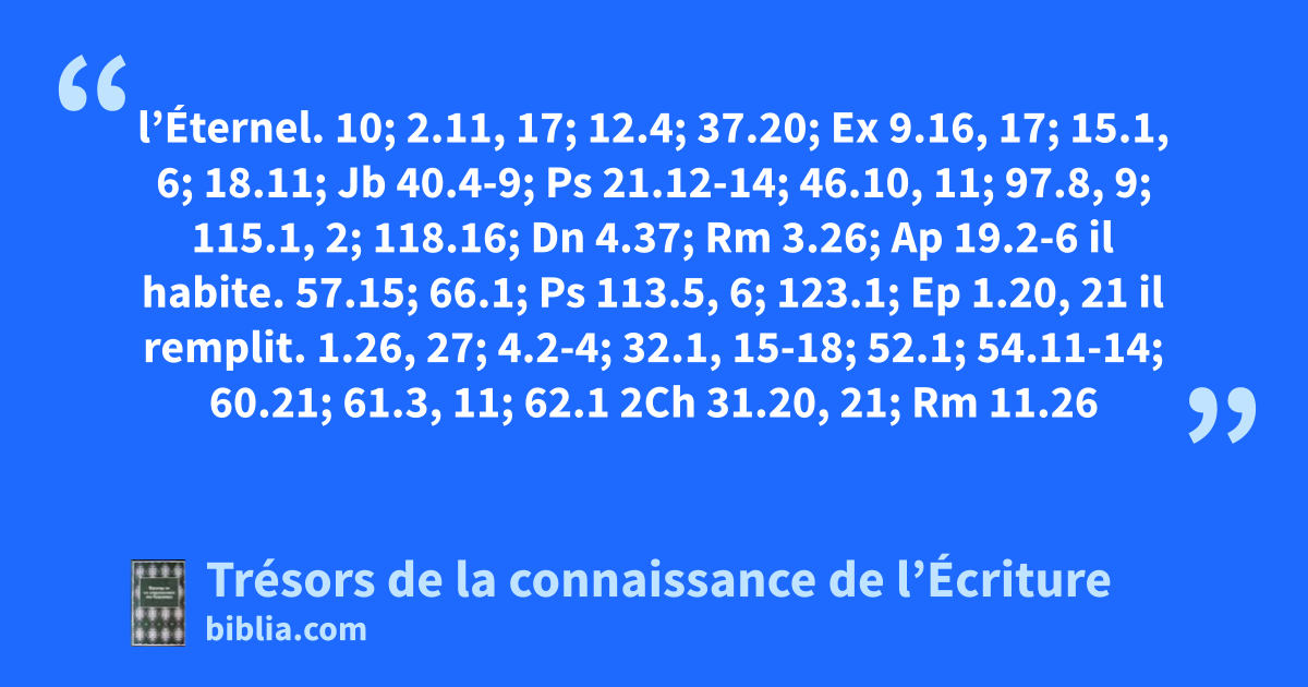 l’Éternel. 10; 2.11, 17; 12.4; 37.20; Ex 9.16, 17; 15.1, 6; 18.11; Jb 40.4-9; Ps 21.12-14; 46.10, 11; 97.8, 9; 115.1, 2; 118.16; Dn 4.37; Rm 3.26; Ap 19.2-6 il habite. 57.15; 66.1; Ps 113.5, 6; 123.1; Ep 1.20, 21 il remplit. 1.26, 27; 4.2-4; 32.1, 15-18; 52.1; 54.11-14; 60.21; 61.3, 11; 62.1 2Ch 31.20, 21; Rm 11.26