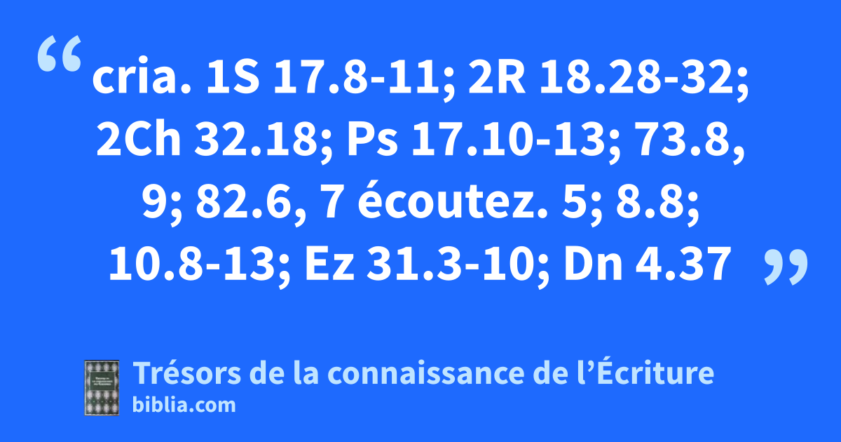 cria. 1S 17.8-11; 2R 18.28-32; 2Ch 32.18; Ps 17.10-13; 73.8, 9; 82.6, 7 écoutez. 5; 8.8; 10.8-13; Ez 31.3-10; Dn 4.37