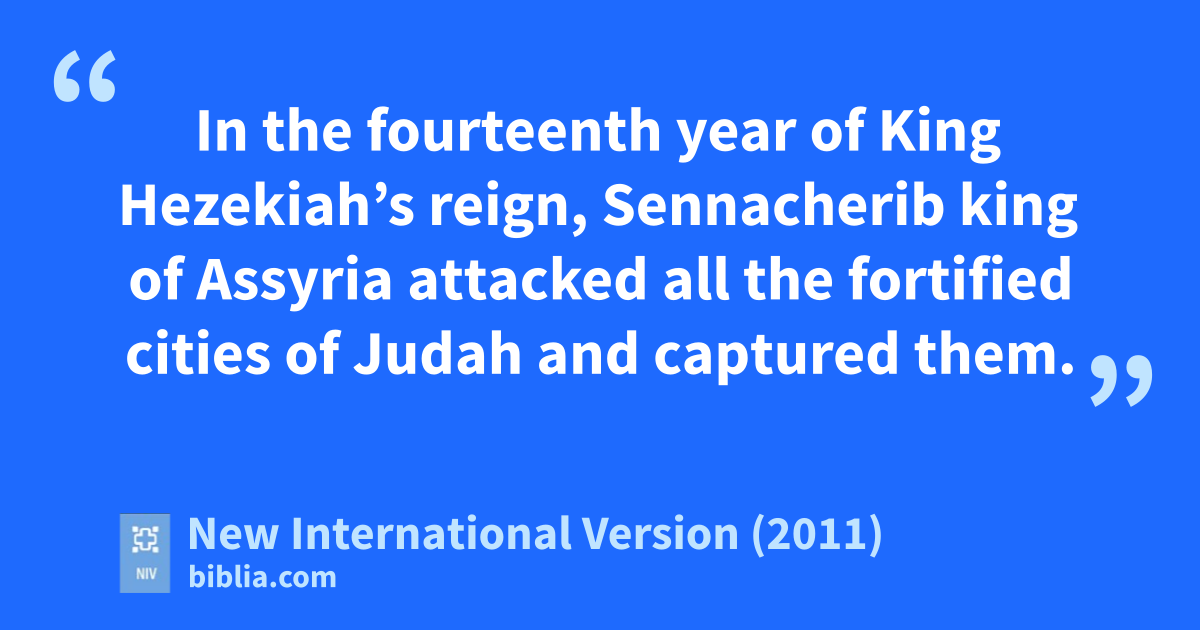 36 In the fourteenth year of King Hezekiah’st reign, Sennacheribu king of Assyria attacked all the fortified cities of Judah and captured them.v 2 Then the king of Assyria sent his field commander with a large army from Lachishw to King Hezekiah at Jerusalem. When the commander stopped at the aqueduct of the Upper Pool, on the road to the Launderer’s Field,x 3 Eliakimy son of Hilkiah the palace administrator,z Shebnaa the secretary,b and Joahc son of Asaph the recorderd went out to him.