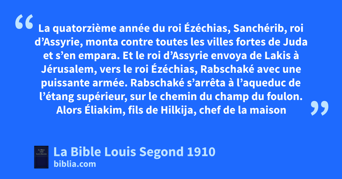 1La quatorzième année du roi Ézéchias, Sanchérib, roi d’Assyrie, monta contre toutes les villes fortes de Juda et s’en empara. 2Et le roi d’Assyrie envoya de Lakis à Jérusalem, vers le roi Ézéchias, Rabschaké avec une puissante armée. Rabschaké s’arrêta à l’aqueduc de l’étang supérieur, sur le chemin du champ du foulon. 3Alors Éliakim, fils de Hilkija, chef de la maison du roi, se rendit auprès de lui, avec Schebna, le secrétaire, et Joach, fils d’Asaph, l’archiviste. 4Rabschaké leur dit: Dites à Ézéchias: Ainsi parle le grand roi, le roi d’Assyrie: Quelle est cette confiance, sur laquelle tu t’appuies? 5Je te le dis, ce ne sont que des paroles en l’air: il faut pour la guerre de la prudence et de la force. En qui donc as-tu placé ta confiance, pour t’être révolté contre moi? 6Voici, tu l’as placée dans l’Égypte, tu as pris pour soutien ace roseau cassé, qui pénètre et perce la main de quiconque s’appuie dessus: tel est Pharaon, roi d’Égypte, pour tous ceux qui se confient en lui. 7Peut-être me diras-tu: C’est en l’Éternel, notre Dieu, que nous nous confions. Mais n’est-ce pas lui dont Ézéchias a fait disparaître les hauts lieux et les autels, en disant à Juda et à Jérusalem: Vous vous prosternerez devant cet autel? 8Maintenant, fais une convention avec mon maître, le roi d’Assyrie, et je te donnerai deux mille chevaux, si tu peux fournir des cavaliers pour les monter. 9Comment repousserais-tu un seul chef d’entre les moindres serviteurs de mon maître? Tu mets ta confiance dans l’Égypte pour les chars et pour les cavaliers. 10D’ailleurs, est-ce sans la volonté de l’Éternel que je suis monté contre ce pays pour le détruire? L’Éternel m’a dit: Monte contre ce pays, et détruis-le. 11Éliakim, Schebna et Joach dirent à Rabschaké: Parle à tes serviteurs en araméen, car nous le comprenons; et ne nous parle pas en langue judaïque aux oreilles du peuple qui est sur la muraille. 12Rabschaké répondit: Est-ce à ton maître et à toi que mon maître m’a envoyé dire ces paroles? N’est-ce pas à ces hommes assis sur la muraille pour manger leurs excréments et pour boire leur urine avec vous? 13Puis Rabschaké s’avança et cria de toute sa force en langue judaïque: Écoutez les paroles du grand roi, du roi d’Assyrie! 14Ainsi parle le roi: Qu’Ézéchias ne vous abuse point, car il ne pourra vous délivrer. 15Qu’Ézéchias ne vous amène point à vous confier en l’Éternel, en disant: L’Éternel nous délivrera, cette ville ne sera pas livrée entre les mains du roi d’Assyrie. 16N’écoutez point Ézéchias; car ainsi parle le roi d’Assyrie: Faites la paix avec moi, rendez-vous à moi, et chacun de vous mangera de sa vigne et de son figuier, et chacun boira de l’eau de sa citerne, 17jusqu’à ce que je vienne, et que je vous emmène dans un pays comme le vôtre, dans un pays de blé et de vin, un pays de pain et de vignes. 18Qu’Ézéchias ne vous séduise point, en disant: L’Éternel nous délivrera. Les dieux des nations ont-ils délivré chacun son pays de la main du roi d’Assyrie? 19Où sont les dieux de Hamath et d’Arpad? Où sont les dieux de Sepharvaïm? Ont-ils délivré Samarie de ma main? 20Parmi tous les dieux de ces pays, quels sont ceux qui ont délivré leur pays de ma main, pour que l’Éternel délivre Jérusalem de ma main?
