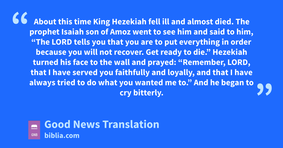 38 About this time King Hezekiah fell ill and almost died. The prophet Isaiah son of Amoz went to see him and said to him, “The Lord tells you that you are to put everything in order because you will not recover. Get ready to die.”