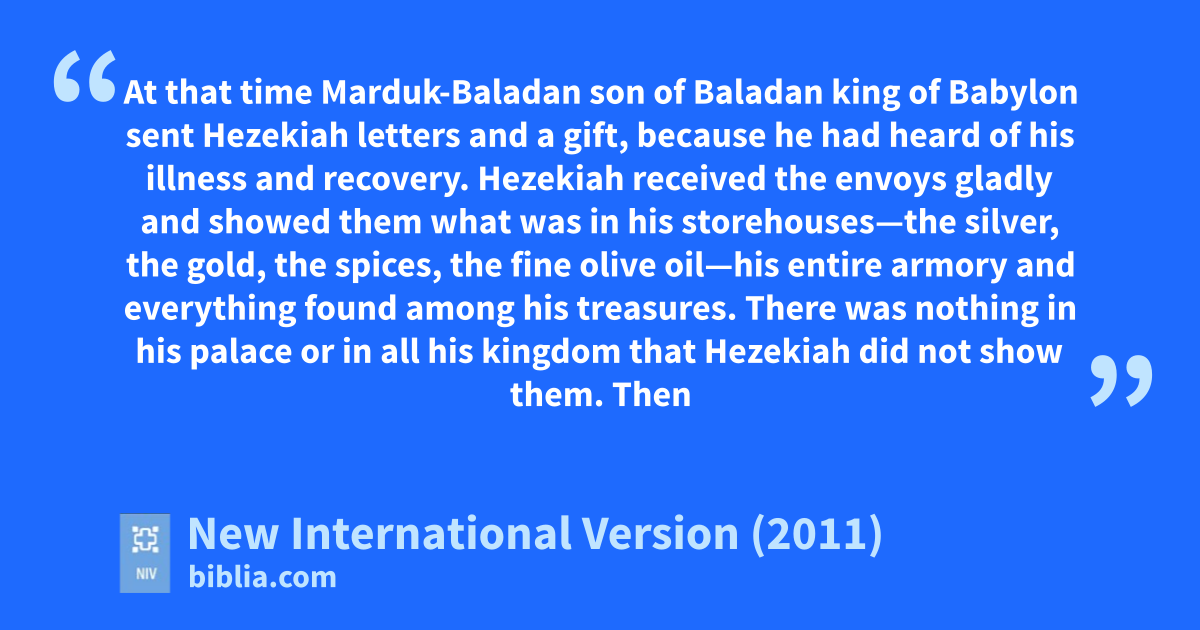 39 At that time Marduk-Baladan son of Baladan king of Babylonj sent Hezekiah letters and a gift, because he had heard of his illness and recovery. 2 Hezekiah received the envoysk gladly and showed them what was in his storehouses—the silver, the gold,l the spices, the fine olive oil—his entire armory and everything found among his treasures.m There was nothing in his palace or in all his kingdom that Hezekiah did not show them.