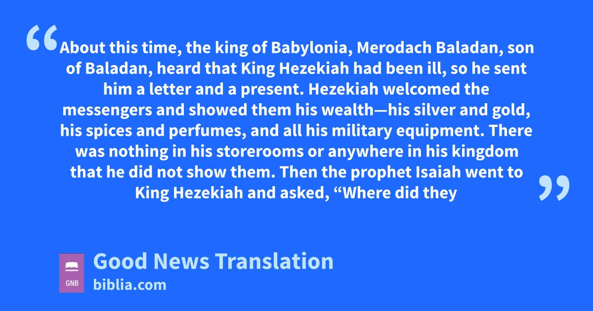 39 About this time, the king of Babylonia, Merodach Baladan, son of Baladan, heard that King Hezekiah had been ill, so he sent him a letter and a present. 2Hezekiah welcomed the messengers and showed them his wealth—his silver and gold, his spices and perfumes, and all his military equipment. There was nothing in his storerooms or anywhere in his kingdom that he did not show them. 3Then the prophet Isaiah went to King Hezekiah and asked, “Where did they come from and what did they say to you?”