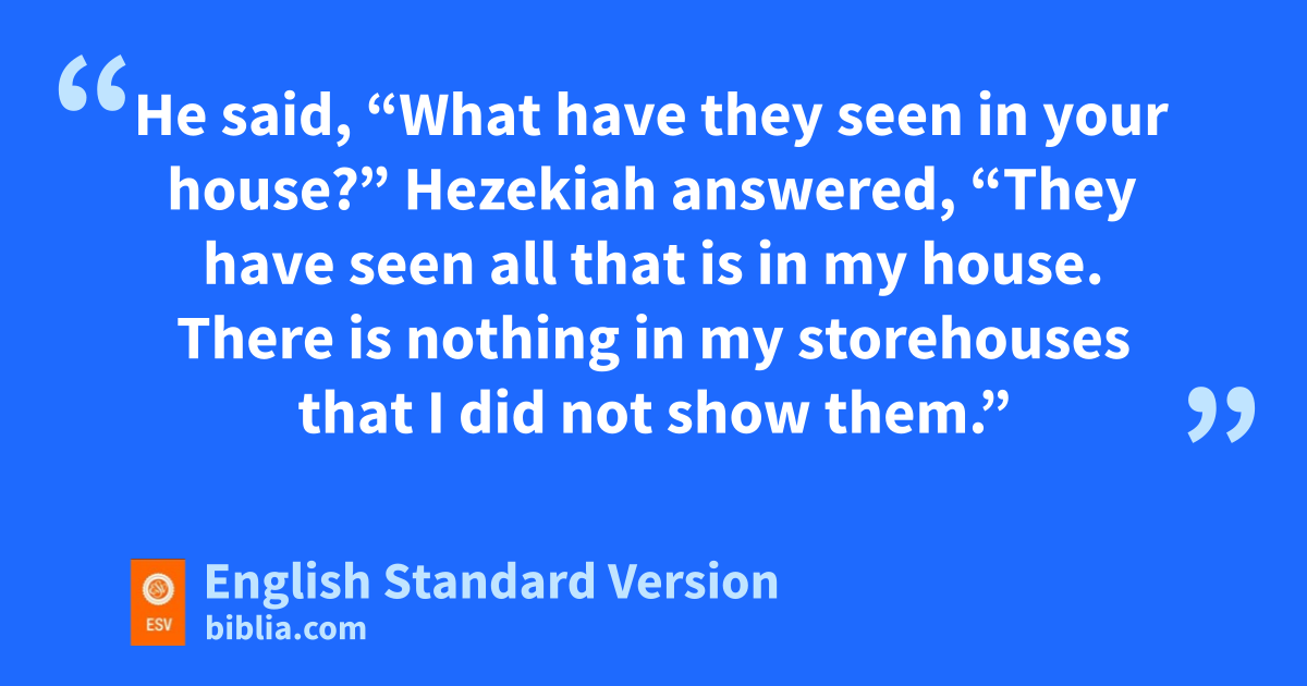 39 sAt that time Merodach-baladan the son of Baladan, king of Babylon, tsent envoys with letters and a present to Hezekiah, for he heard that he had been sick and had recovered. 2 And Hezekiah welcomed them gladly. And he showed them his treasure house, uthe silver, the gold, the spices, the precious oil, his whole armory, all that was found in his storehouses. vThere was nothing in his house or in all his realm that Hezekiah did not show them. 3 Then Isaiah the prophet came to King Hezekiah, and said to him, “What did these men say? And from where did they come to you?” Hezekiah said, “They have come to me from a far country, from Babylon.” 4 He said, “What have they seen in your house?” Hezekiah answered, “They have seen all that is in my house. There is nothing in my storehouses that I did not show them.”