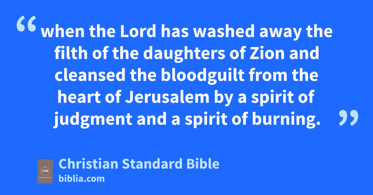 2 On that day the BranchB of the Lord will be beautiful and glorious,u and the fruit of the landv will be the pride and gloryw of Israel’s survivors.x 3 Whoever remains in Zion and whoever is left in Jerusalemy will be called holyz—all in Jerusalem written in the book of lifeC,aa—4 when the Lord has washed away the filthab of the daughters of Zion and cleansed the bloodguiltac from the heart of Jerusalem by a spirit of judgmentad and a spirit of burning.ae 5 Then the Lord will createaf a cloud of smoke by dayag and a glowing flame of fire by night over the entire site of Mount Zion and over its assemblies. For there will be a canopy over all the glory,D 6 and there will be a shelter for shade from heat by day and a refuge and shelter from storm and rain.ah