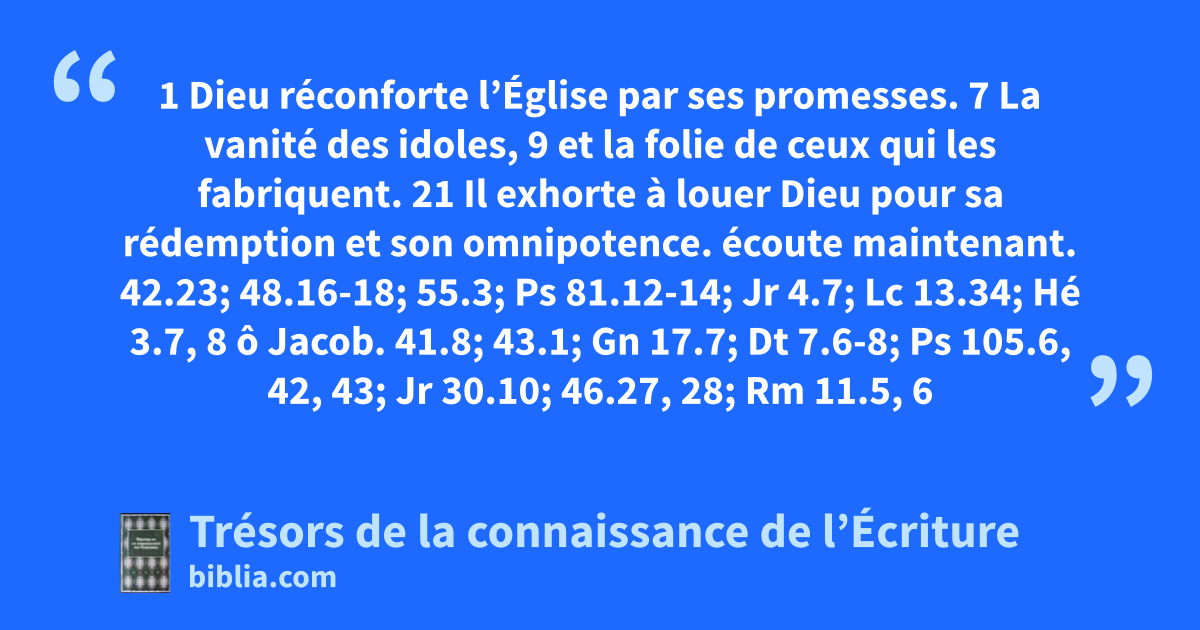 1 Dieu réconforte l’Église par ses promesses. 7 La vanité des idoles, 9 et la folie de ceux qui les fabriquent. 21 Il exhorte à louer Dieu pour sa rédemption et son omnipotence.