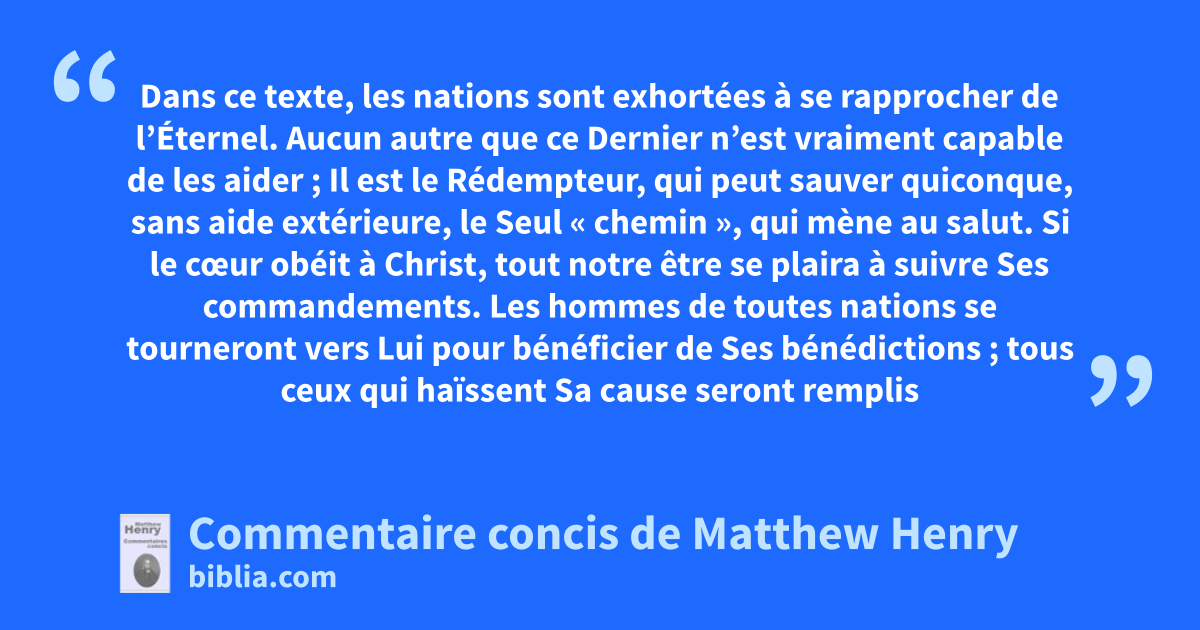 Dans ce texte, les nations sont exhortées à se rapprocher de l’Éternel. Aucun autre que ce Dernier n’est vraiment capable de les aider ; Il est le Rédempteur, qui peut sauver quiconque, sans aide extérieure, le Seul « chemin », qui mène au salut.