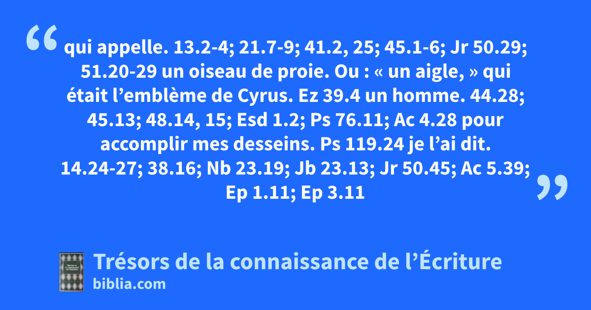 qui appelle. 13.2-4; 21.7-9; 41.2, 25; 45.1-6; Jr 50.29; 51.20-29 un oiseau de proie. Ou : « un aigle, » qui était l’emblème de Cyrus. Ez 39.4 un homme. 44.28; 45.13; 48.14, 15; Esd 1.2; Ps 76.11; Ac 4.28 pour accomplir mes desseins. Ps 119.24 je l’ai dit. 14.24-27; 38.16; Nb 23.19; Jb 23.13; Jr 50.45; Ac 5.39; Ep 1.11; Ep 3.11