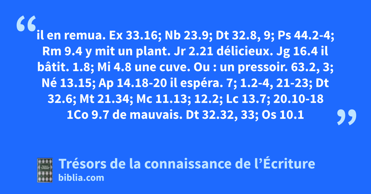 il en remua. Ex 33.16; Nb 23.9; Dt 32.8, 9; Ps 44.2-4; Rm 9.4 y mit un plant. Jr 2.21 délicieux. Jg 16.4 il bâtit. 1.8; Mi 4.8 une cuve. Ou : un pressoir. 63.2, 3; Né 13.15; Ap 14.18-20 il espéra. 7; 1.2-4, 21-23; Dt 32.6; Mt 21.34; Mc 11.13; 12.2; Lc 13.7; 20.10-18 1Co 9.7 de mauvais. Dt 32.32, 33; Os 10.1